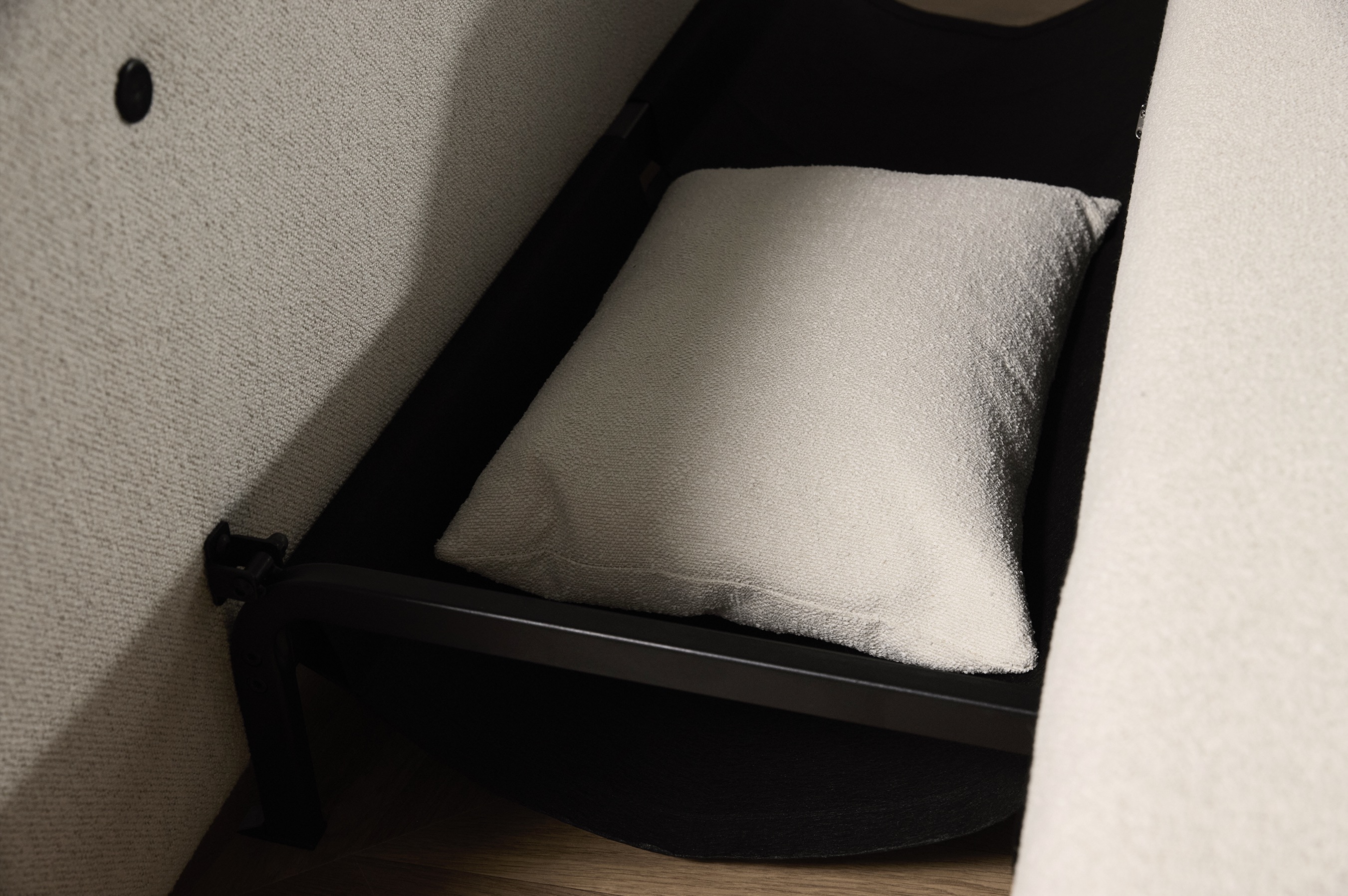 Подушки для спины и ящик для хранения постельных принадлежностей в комплекте.