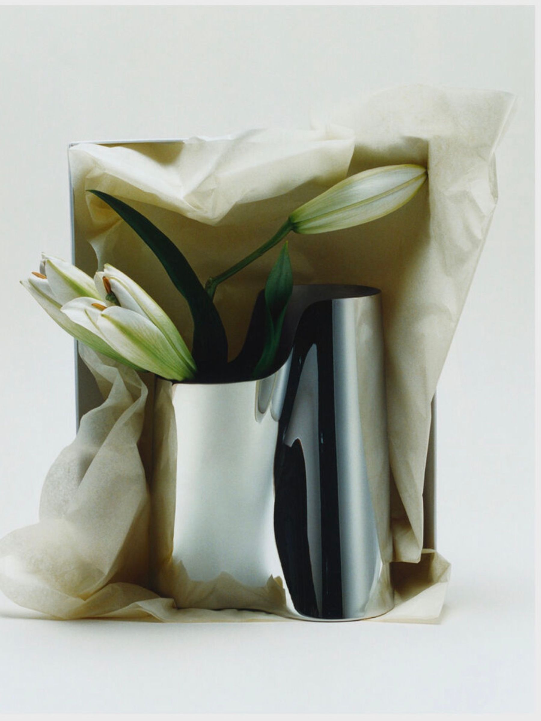 Эта скульптурная ваза — творение датского архитектора и дизайнера Анны Бойсен. Изготовленная из отполированной вручную нержавеющей стали, ее элегантная форма отличается различной высотой и углами, что способствует созданию креативных цветочных композиций. Видение Бойсен заключалось в разработке изделия, которое поддерживало бы всю продолжительность жизни цветка, а динамическая структура вазы гарантирует, что любая композиция будет выглядеть аккуратно, поскольку цветы меняют форму и вид с течением времени.